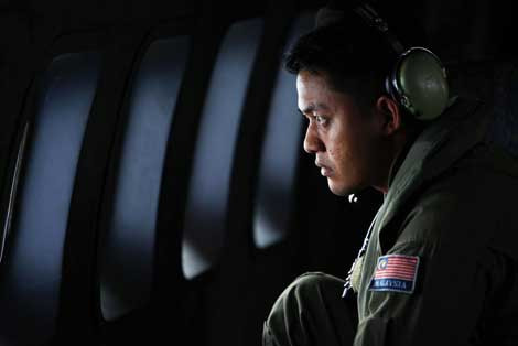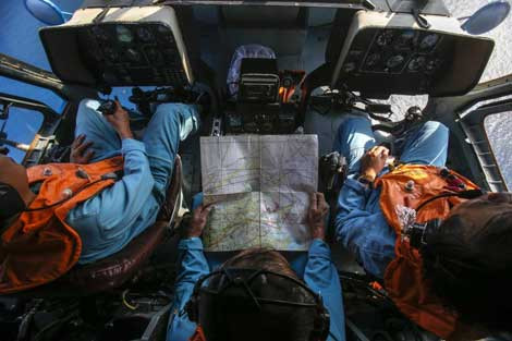 MH 370 mất tích chỉ sau 1 giờ cất cánh. Các cuộc tìm kiếm đầu tiên diễn ra tại biển Đông nơi theo lịch trình máy bay sẽ bay qua. Trong ảnh là buồng lái của trực thăng thuộc không quân Việt Nam đang tìm kiếm MH370 ngoài khơi đảo Thổ Chu.
