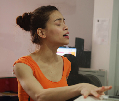 Sau đó Hà qua tập vũ đạo cùng vũ đoàn Hoàng Thông. Mỗi ngày cô phải tập với nhóm từ 2 - 3 tiếng. |