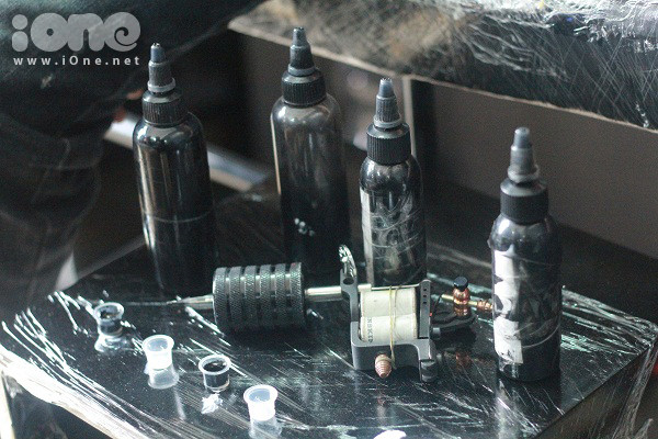 Những lọ màu, dụng cụ xăm được 9x Hà thành giữ sạch sẽ, cẩn thận. Trong quá trình xăm hình cho khách, những lọ thuốc được dùng sẽ được để trên một lớp bọc ở ghế để vừa đảm bảo vệ sinh và an toàn cho khách.
