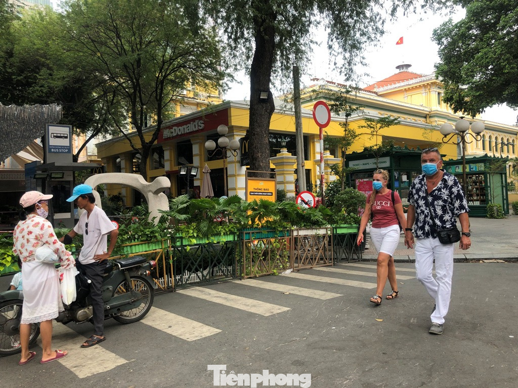Những vị khách nước ngoài bịt kín khẩu trang, đi dạo gần khu vực đường sách Nguyễn Văn Bình (Q.1), tuy nhiên nơi này đã tạm ngừng hoạt động