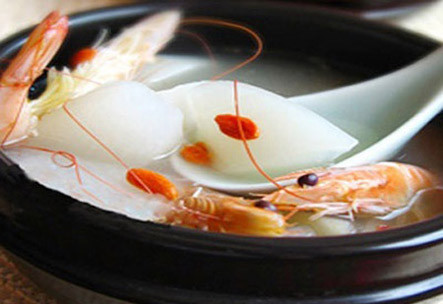 Canh tôm củ cải trắng: Củ cải trắng 150g, đậu phụ 100, tôm nhỏ 50g, giá đậu tương (hoặc đậu xanh) 50g; gừng 3g, hành 5g, tỏi 5g, dầu 30g, bột canh. Cải trắng rửa sạch, cắt miếng; giá đậu rửa sạch, bỏ rễ; đậu phụ rửa sạch cắt miếng vuông; tôm rửa sạch, gừng cắt lát; hành cắt khúc; tỏi bỏ vỏ, cắt lát.