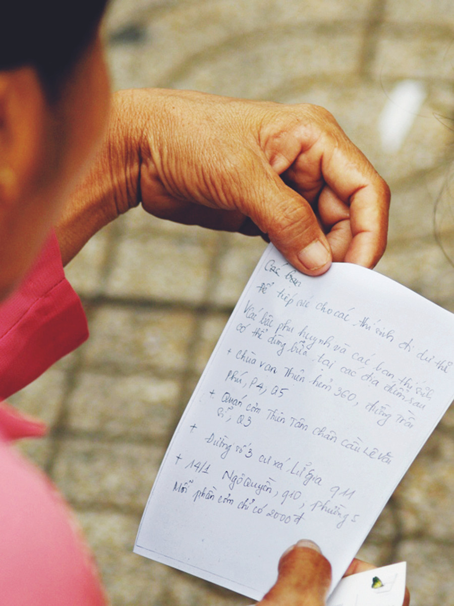 Trong tờ giấy đó là địa điểm những nơi ăn trưa, nghỉ trưa miễn phí và giá rẻ ngay xung quanh trường thi mà các bạn sinh viên tình nguyện đã cẩn thận ghi lại tỉ mỉ và phát cho những phụ huynh đang lo âu chờ con thi xong.