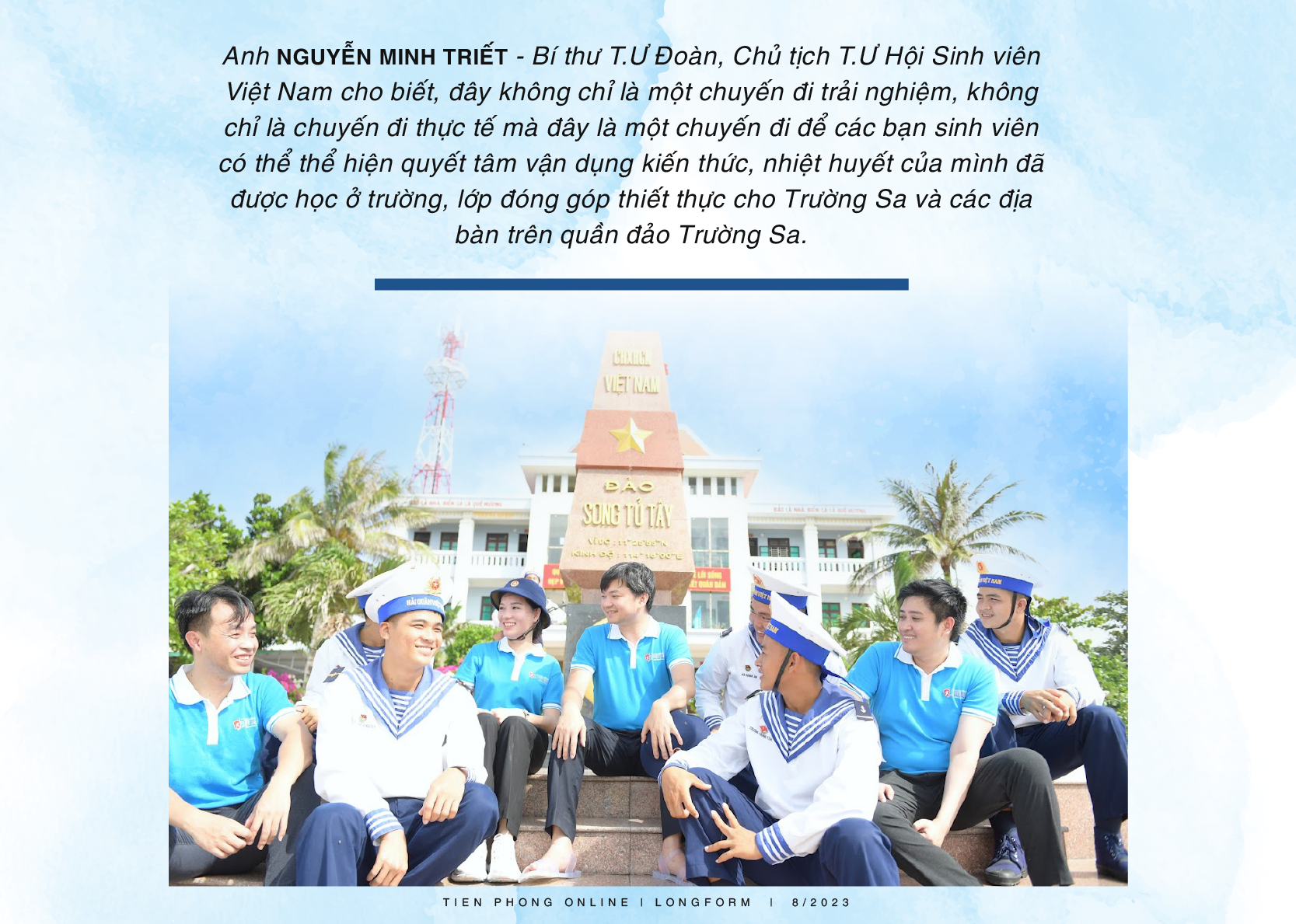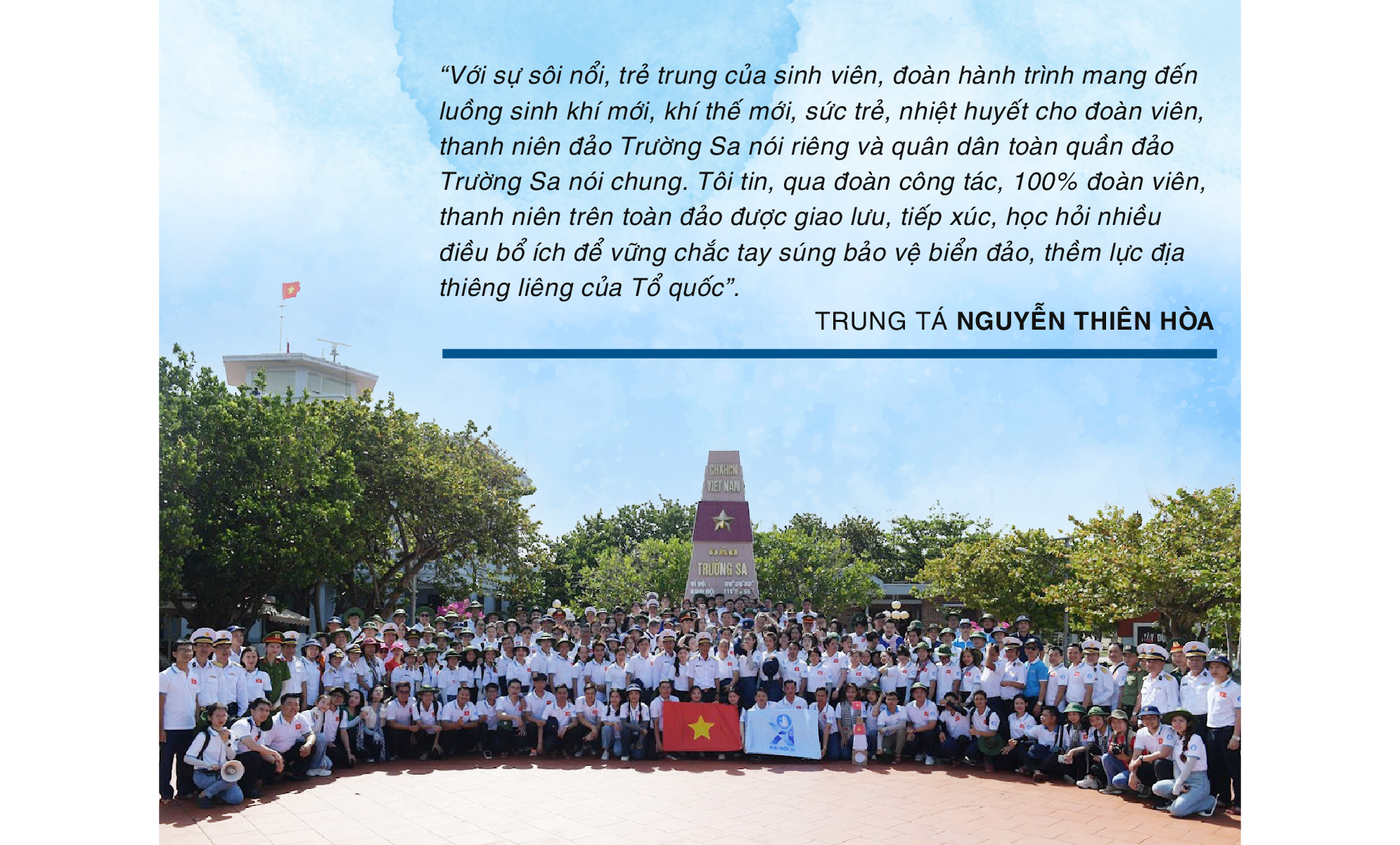 Trung tá Nguyễn Thiên Hòa - Phó Chỉ huy trưởng đảo Trường Sa, Lữ đoàn 146, Vùng 4 Hải quân cho biết, năm 2023, đảo Trường Sa đón các đoàn ra công tác ở đây, trong đó, đoàn công tác số 17 của Hành trình “Sinh viên với biển đảo Tổ quốc” năm 2023 mang dấu ấn nổi bật nhất. “Với sự sôi nổi, trẻ trung của sinh viên, đoàn hành trình mang đến luồng sinh khí mới, khí thế mới, sức trẻ, nhiệt huyết cho đoàn viên, thanh niên đảo Trường Sa nói riêng và quân dân toàn quần đảo Trường Sa nói chung. Tôi tin, qua đoàn công tác, 100% đoàn viên, thanh niên trên toàn đảo được giao lưu, tiếp xúc, học hỏi nhiều điều bổ ích để vững chắc tay súng bảo vệ biển đảo, thềm lục địa thiêng liêng của Tổ quốc”, Trung tá Nguyễn Thiên Hòa nói.
