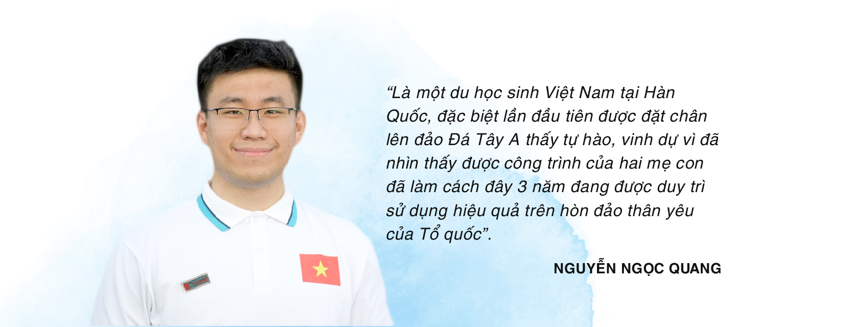 Ngọc Quang chia sẻ: “Là một du học sinh Việt Nam tại Hàn Quốc, đặc biệt lần đầu tiên được đặt chân lên đảo Đá Tây A thấy tự hào, vinh dự vì đã nhìn thấy được công trình của hai mẹ con đã làm cách đây 3 năm đang được duy trì sử dụng hiệu quả trên hòn đảo thân yêu của Tổ quốc. Đây là động lực lớn lao mang đến cho tôi bầu nhiệt huyết mãnh liệt để tôi có thể cống hiến nhiều hơn trong lĩnh vực nghiên cứu khoa học và có thêm nhiều hoạt động hướng về biển đảo quê hương”. Quang cho biết, sẽ nỗ lực hơn nữa trong nghiên cứu khoa học để cùng với mẹ triển khai thêm nhiều dự án thiết thực tại Trường Sa trong một tương lai không xa.
