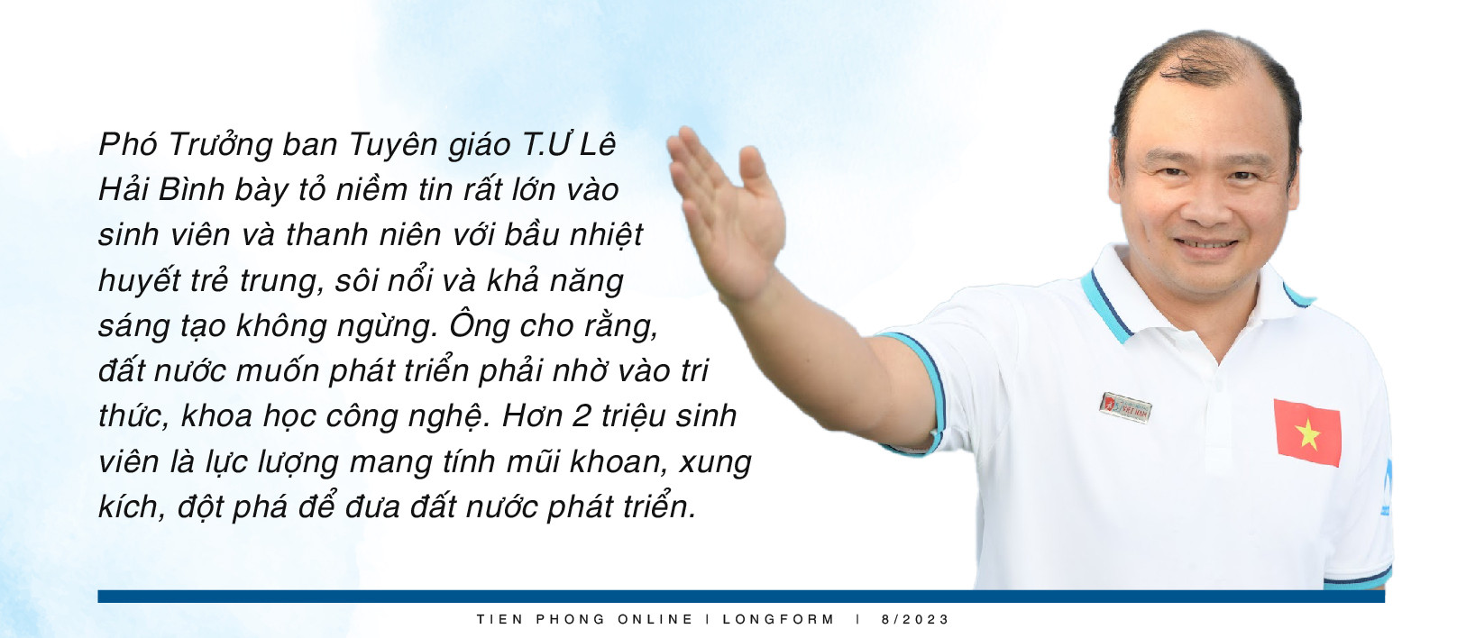 Trong Hành trình “Sinh viên với biển, đảo Tổ quốc” năm 2023 có sự đồng hành của Phó Trưởng ban Tuyên giáo T.Ư Lê Hải Bình với nhiều sự giao lưu, trao đổi đầy tình cảm, tâm huyết với sinh viên trong suốt hành trình. Đây là chuyến đi thứ 4 của ông đến với Trường Sa. Mặc dù bộn bề công việc nhưng khi nhận được lời mời của T.Ư Hội Sinh viên Việt Nam ông đã đồng ý ngay, vì mong muốn đồng hành cùng các bạn sinh viên – những người trẻ trung, sôi nổi, tràn đầy năng lượng và khả năng sáng tạo.