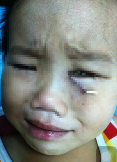 Cây kim lớn này đã đâm thẳng vào bên dưới con mắt trái cháu bé. Người nhà đưa P. vào cấp cứu tại Bệnh viện đa khoa tỉnh Sóc Trăng với vết thương rách dài nơi mắt trái. Tại đây chỉ khâu vết thương, cho biết còn dị vật nằm trong mắt nhưng không chuyển bệnh mà hướng dẫn gia đình tự đưa bé lên TPHCM lấy dị vật.