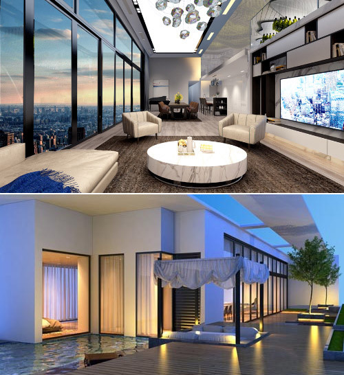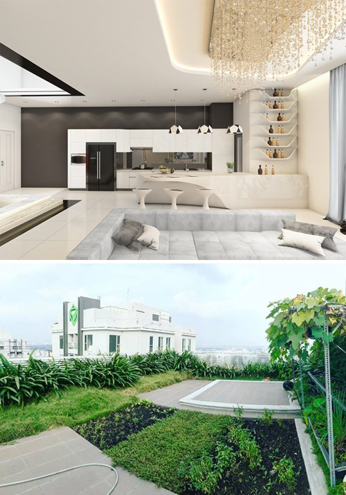 TP HCM: Căn hộ của người mẫu Ngọc Trinh nằm trên hai tầng 33-34 thông nhau, có tổng diện tích sử dụng 180 m2. Trên mái còn có khoảng sân vườn trồng cây cảnh, rau xanh rộng 100 m2. Giá mua nhà và trang bị nội thất là 20 tỷ đồng. Ảnh: iOne.