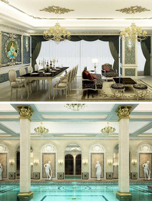 Hà Nội: Các căn hộ trong một tòa tháp ở quận Cầu Giấy lấy cảm hứng từ phong cách Hoàng gia châu Âu. Nội thất được thiết kế cầu kỳ với các nguyên vật liệu cao cấp, một số chi tiết còn được mạ vàng. Bên trong khu nhà có bể bơi chung. Nhà được chào bán với giá khoảng 100 triệu đồng một m2. Ảnh: DPL.