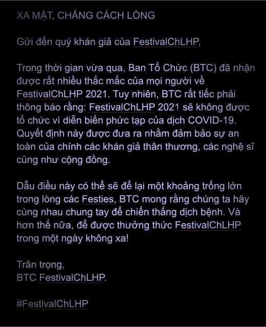 "Trong thời gian vừa qua, Ban Tổ Chức (BTC) đã nhận được nhiều thắc mắc của mọi người về FestivalChLHP 2021. Tuy nhiên, BTC rất tiếc phải thông báo rằng: FestivalChLHP 2021 sẽ không được tổ chức vì diễn biến phức tạp của dịch COVID-19. Quyết định này được đưa ra nhằm đảm bảo sự an toàn của chính các khán giả thân thương, các nghệ sĩ cũng như cộng đồng."