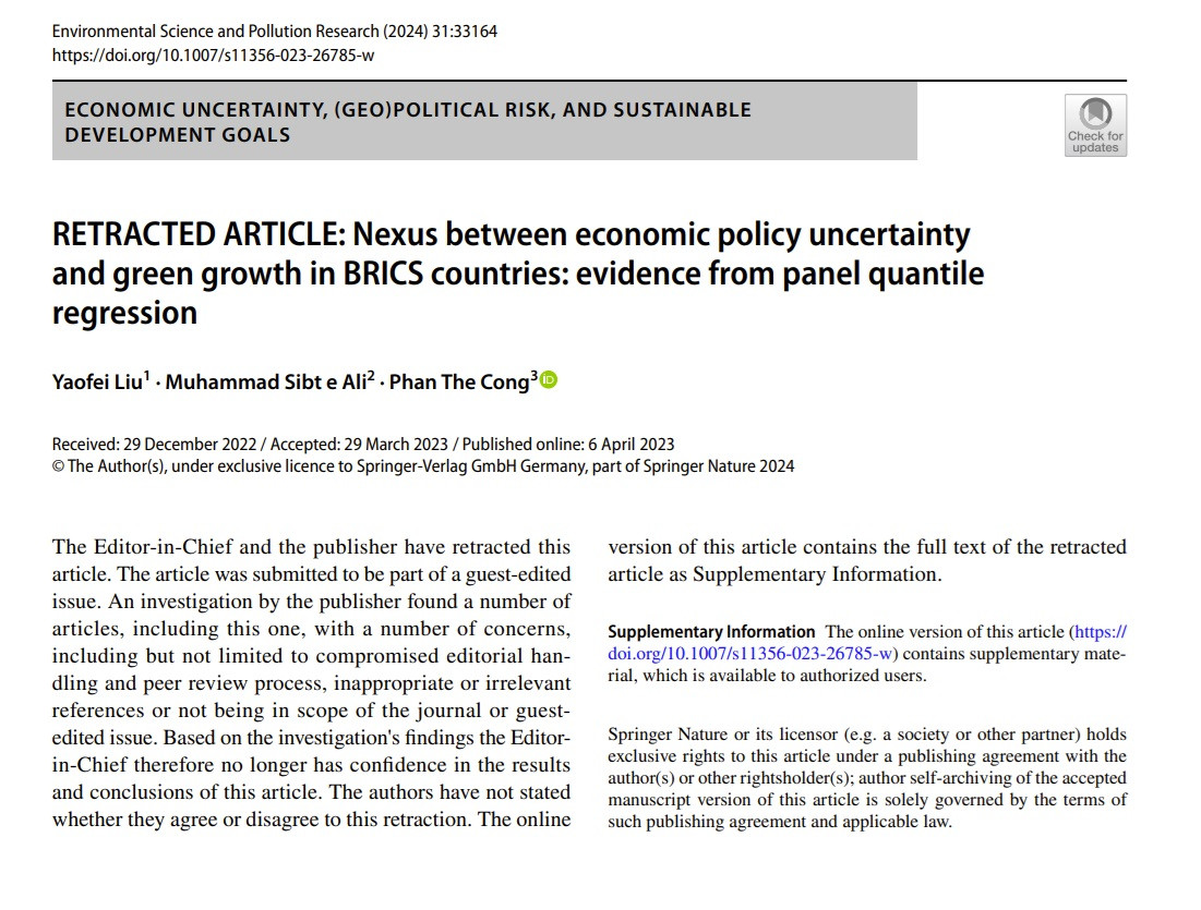 Theo thông báo được đăng trên website của Nhà xuất bản Springer, Tổng biên tập tạp chí Environmental Science and Pollution Research (Khoa học môi trường và Nghiên cứu về ô nhiễm) và Nhà xuất bản Springer (Đức) đã quyết định rút bài báo: Nexus between economic policy uncertainty and green growth in BRICS countries: evidence from panel quantile regression (Mối liên hệ giữa sự không chắc chắn về chính sách kinh tế và tăng trưởng xanh ở các nước BRICS: bằng chứng từ hồi quy phân vị bảng). Bài báo này đã được xuất bản năm 2023 trong một số được biên tập bởi biên tập viên khách mời.