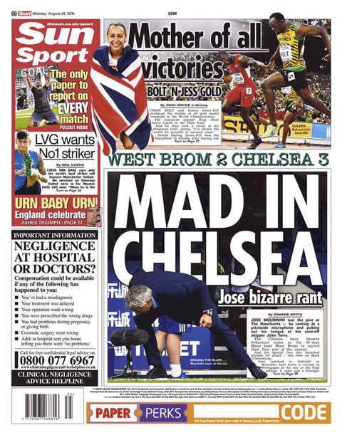 Trang nhất tờ The Sun hôm qua đã dành khá nhiều đất để đăng hình Mourinho đang hét vào chiếc micro bên ngoài đường piste khi tiếng còi kết thúc trận đấu vang lên. Đây có thể động thái nhằm giải tỏa sức ép mà Chelsea phải chịu đựng ở những phút cuối khi họ phải chơi với 10 người, trong bối cảnh phải bảo vệ cách biệt mong manh.