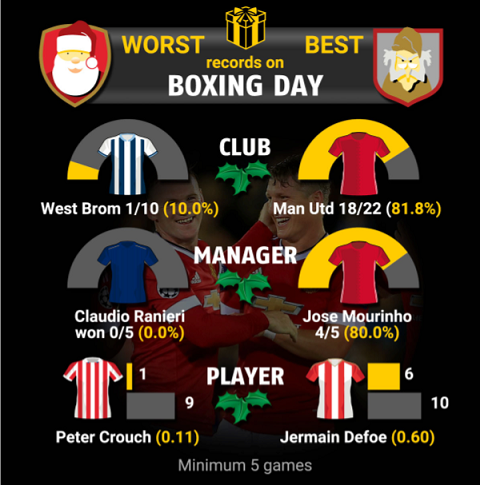 Tuy nhiên, với MU và HLV Mourinho thì lại là câu chuyện khác. Họ luôn được hưởng niềm vui trong ngày Lễ tặng quà. Những con số thống kê đã chi ra điều đó.