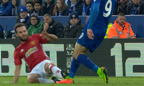 Tình huống diễn ra ở hiệp một, Juan Mata đạp thẳng gầm giày vào chân Jamie Vardy trong một pha ham bóng. Cú vào bóng nguy hiểm, nhưng trọng tài Anthony Taylor chỉ rút thẻ vàng cảnh cáo tiền vệ người Tây Ban Nha.