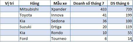 Nếu tính theo tỷ lệ doanh số duy trì được trong tháng 7, cao nhất thị trường thuộc về Mitsubishi Xpander. Trong tháng qua, mẫu xe này đã bán được tổng 433 xe mọi phiên bản. Tuy nhiên gần như tất cả những xe này đều là xe nhập khẩu. Chỉ có 16 xe thuộc diện lắp ráp trong nước được bán trong tháng qua. Đây cũng là mẫu xe duy nhất trên thị trường được hãng duy trì cả lắp ráp trong nước và nhập khẩu. Doanh số của xe trong tháng 7 chỉ bằng 58% so với tháng 6.