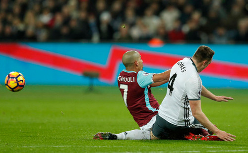 Tuy nhiên, cục diện của trận đấu rẽ sang hướng khác ở phút 15. Sofiane Feghouli sau khi đẩy bóng dài, có động tác lao vào đạp tranh chấp với Phil Jones và ngay lập tức trọng tài Mike Dean rút thẻ đỏ trực tiếp truất quyền thi đấu của cầu thủ người Pháp. Thiếu người, West Ham không còn duy trì được thế trận tấn công như trước đó.