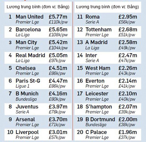 Rất bất ngờ khi M.U lại là đội đứng thứ 4 thế giới và là CLB bóng đá trả lương trung bình số 1 thế giới. Vẫn biết nhắc đến M.U là nhắc đến giàu có nhưng với đội hình không còn nhiều ngôi sao nổi bật thì mức lương trung bình 5,77 triệu bảng/năm vẫn là một con số ngất ngưởng. Lần lượt sau đó là Barca (5,65), Man City (5,42), Real Madrid (5,05)...