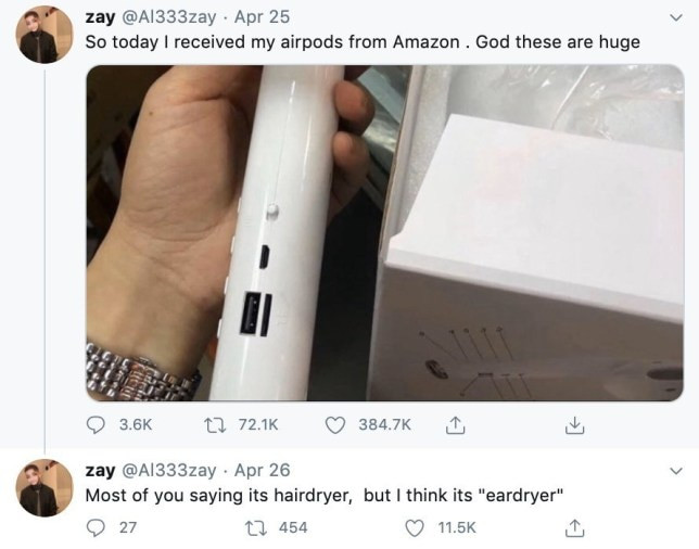 Quá tức tối với kẻ gian thương, Aleezay đã chụp lại bức ảnh cặp tai nghe “siêu to khổng lồ” và chia sẻ nó lên mạng xã hội Twitter với lời than thở: “Hôm nay tôi vừa nhận được cặp AirPods đặt mua ở trên Amazon. Nhưng mà sao nó to quá vậy nè!”.