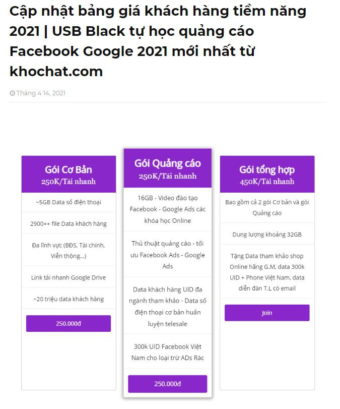 Không chỉ sử dụng phần mềm để tìm dữ liệu khách hàng, trên trang Facebook “Chia sẻ data khách hàng số điện thoại” còn rao bán thông tin của hàng nghìn khách hàng tiềm năng đã update ( cập nhật) danh sách tới tháng 4/2021. Theo đó, chỉ cần bỏ ra 250 nghìn đồng bạn sẽ nhận được 5 Gb dữ liệu khách hàng từ các lĩnh vực bất động sản, đất nền, điện lực, viễn thông, tài chính, ngân hàng, căn hộ, chung cư ở các tỉnh thành lớn như Hà Nội, TP Hồ Chí Minh, Đà Nẵng…