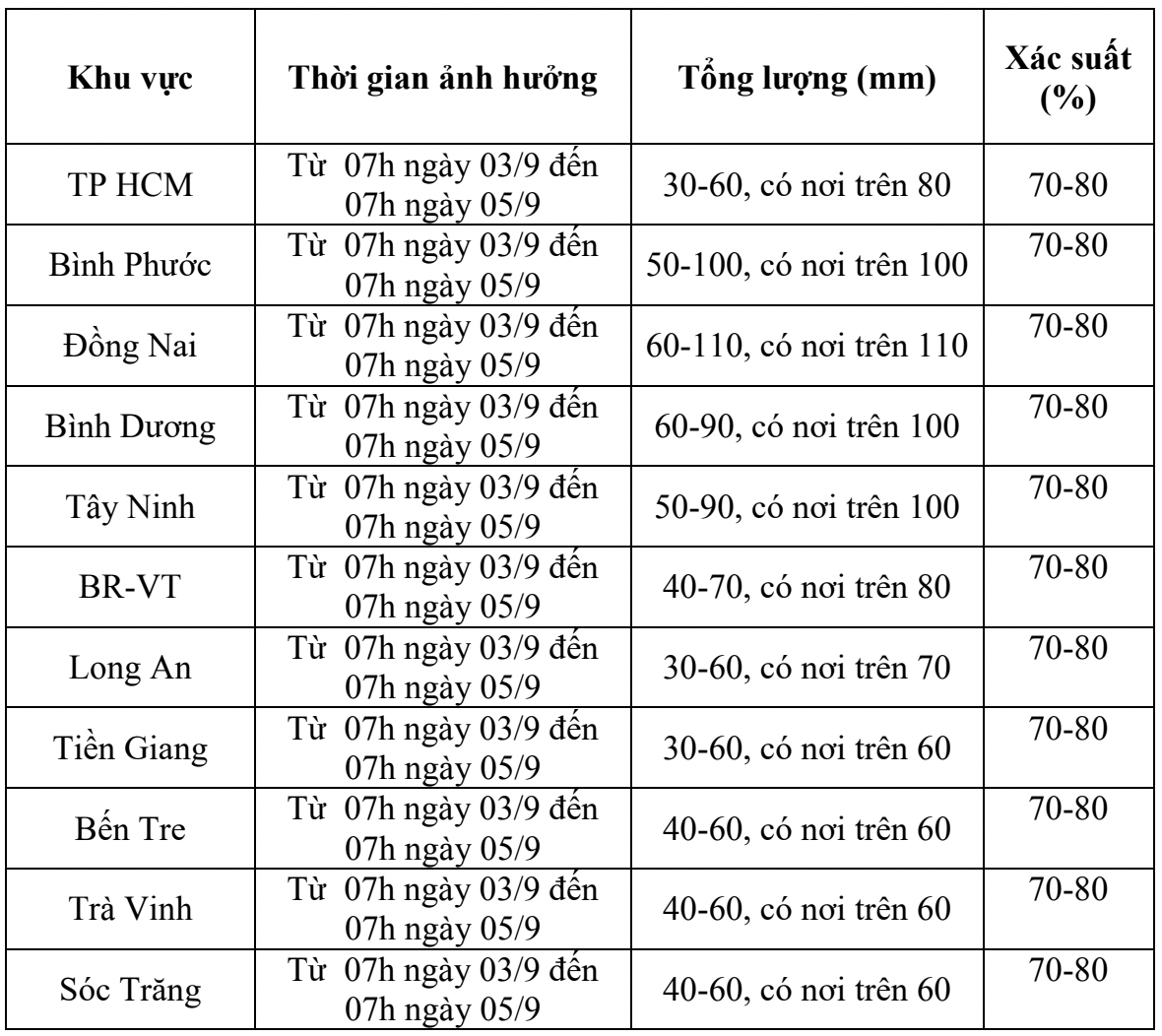 Từ ngày 3/9 đến ngày 5/9, khu vực Nam Bộ có mưa rào nhiều nơi, rải rác mưa vừa và dông, có nơi mưa to đến rất to.
