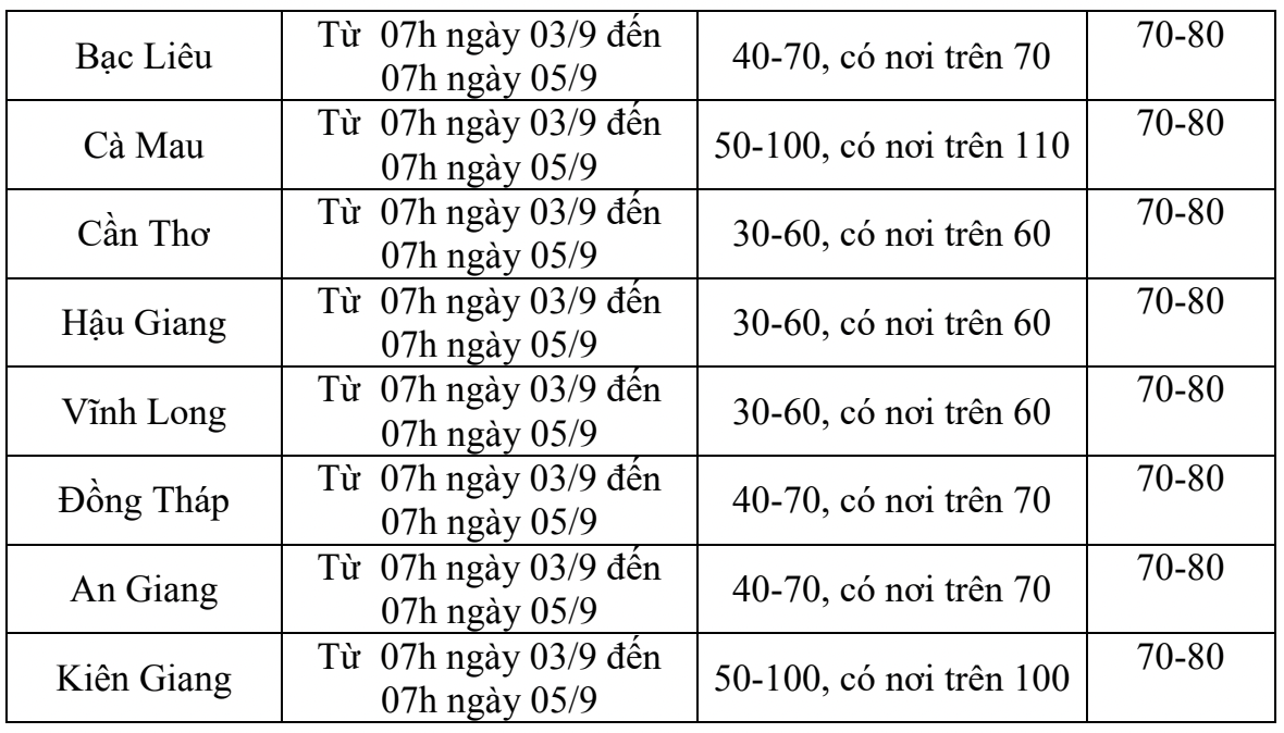 Lượng mưa từ 1h ngày 2/9 đến 1h ngày 3/9 ở một số nơi như sau: U Minh - Cà Mau 68.8mm, Thới Bình - Cà Mau 70.6mm, Ngan Dừa - Bạc Liêu 70.0mm, Thị trấn Rạch Gòi - Hậu Giang 78.6mm, Gò Quao - Kiên Giang 103.8mm, Giồng Riềng - Kiên Giang 109.6mm, Vĩnh Hòa Hưng - Kiên Giang 109.6mm,...