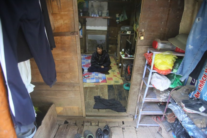 Ngắt quãng giữa những cơn ho, bà Phạm Thị Thu (63 tuổi) nói: “Thời tiết năm nay độc quá, từ đầu mùa rét đến giờ tôi ốm liên tục. Khổ nỗi nhà chẳng kín gió nên cứ đỡ ho mấy hôm là lại tái phát. Hôm giờ mua được mấy vỉ thuốc thì lọt luôn xuống sàn bè rồi”. Vừa nói bà Thu vừa chỉ về phía mấy thanh gỗ lát sàn bè ở ngay cạnh giường đã gẫy mục và nhắc khách vào nhà cẩn thận để không bị sẩy chân.