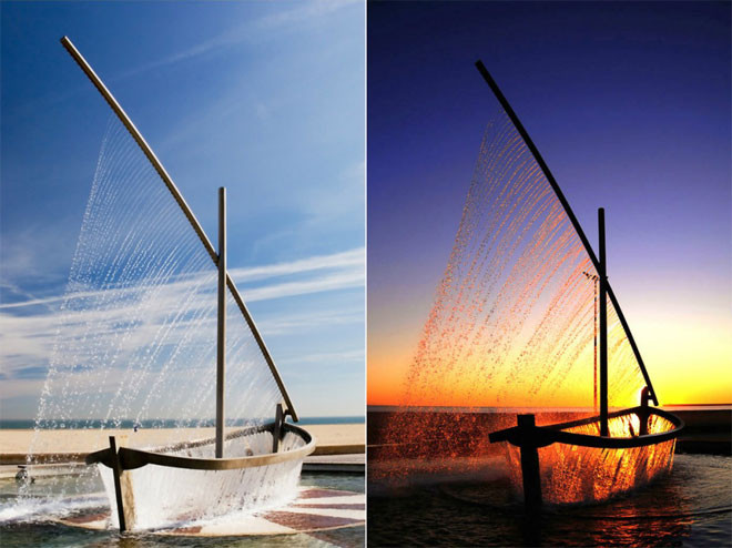 Tác phẩm điêu khắc mang tên Water Boat (Thuyền nước) có hình dáng của một con thuyền giương buồm lướt trên sóng được tạo bởi hàng trăm lỗ phun. Vào hoàng hôn, “chiếc thuyền” đẹp hơn nhờ hiệu ứng ánh sáng Mặt Trời.