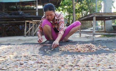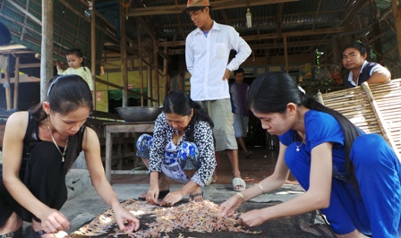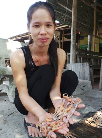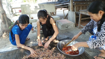 Theo chị Nguyễn Thị Tươi - một chủ cơ sở làm khô nhái cho biết để khô vũ nữ chân dài ngon khâu ướp gia vị là rất quan trọng và phải có tỏi, ớt...