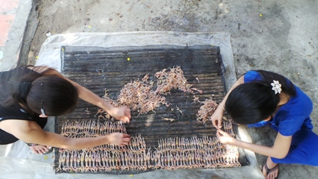 Sau khi nhái thấm gia vị, người dân xếp từng con nhái lên các tấm vĩ tre có lót một lớp lưới bên trên