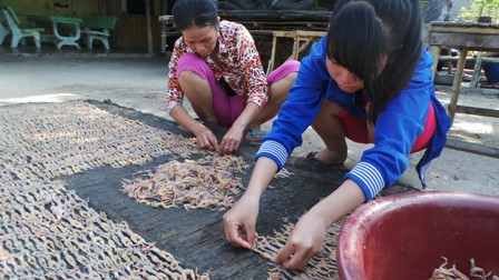 Thời điểm này đến làng khô "vũ nữ chân dài" - khô nhái ở xã Vĩnh Trung (huyện Tịnh Biên An Giang) mới thấy bà con nơi đây đang tất bật vào vụ mùa khô tết. Tuy nhiên, do thời gian này ít mưa, nguồn nhái nguyên liệu giảm một nửa.