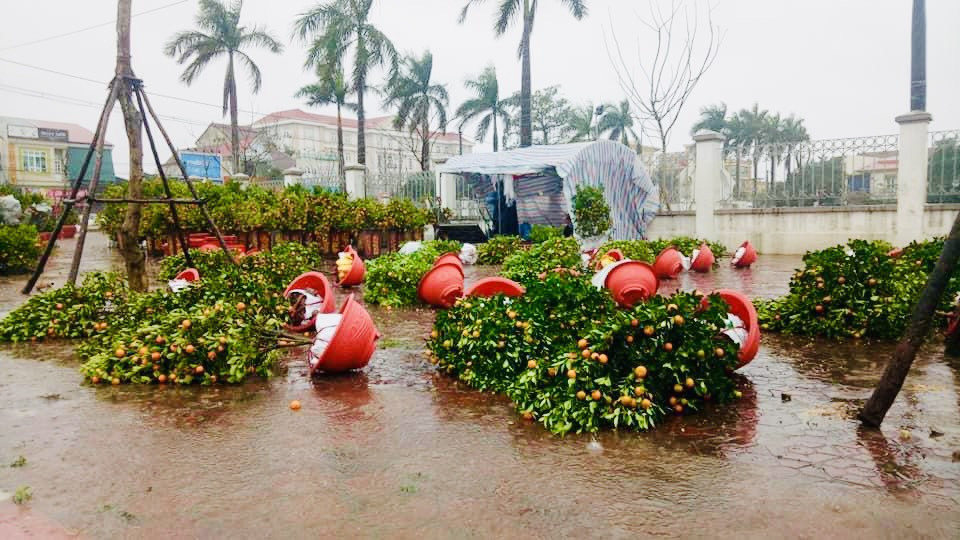 Tại Hà Tĩnh sáng 9/2 mưa to cùng gió đã khiến hàng trăm gốc quất, đào tiểu thương trưng bày bán dịp Tết bị đổ ngã.