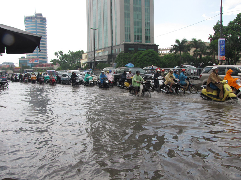 Trận mưa lớn diễn ra đúng vào giờ tan tầm cũng gây ảnh hưởng rất lớn đến giao thông. Tại đường Kim Liên mới, đoạn gần hầm đường bộ, hàng ngàn phương tiện nhích từng tí một để tránh chỗ nước ngập sâu. Phải cố gắng lắm, các phương tiện mới có thể qua được quãng đường dài chưa đến 500 mét này. Nhiều xe chết máy phải dắt bộ dưới nước. Nhiều người đi xe đạp, xe máy bị ngã do va phải gạch, đá trôi dưới dòng nước.Trên các tuyến phố Quang Trung, Bà Triệu, Hồ Xuân Hương, nước chảy thành dòng trên đường, gây khó khăn rất lớn cho người và phương tiện đi lại.