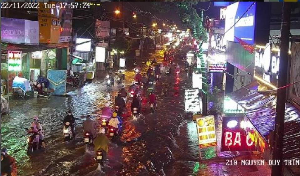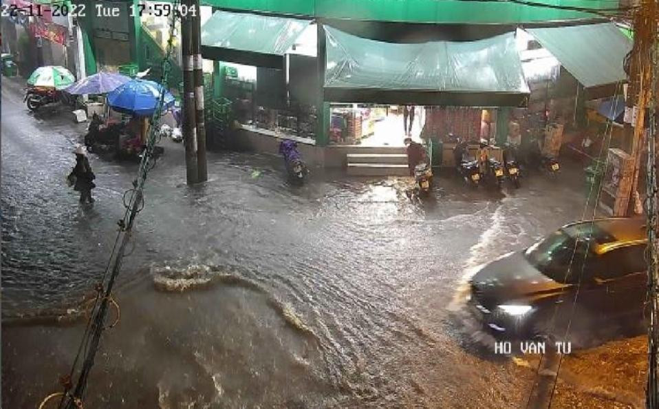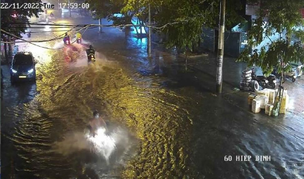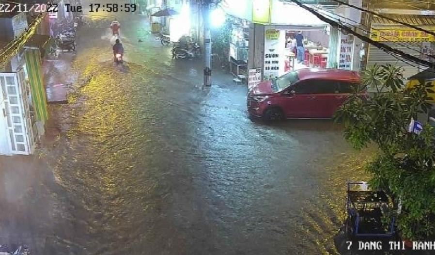 | Camera giao thông ghi nhận một loạt tuyến đường ở TP Thủ Đức xảy ra tình trạng ngập úng trong cơn mưa chiều tối 22/11. |
