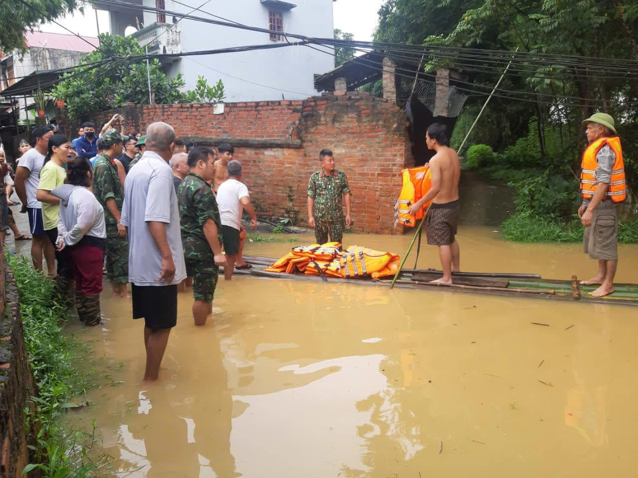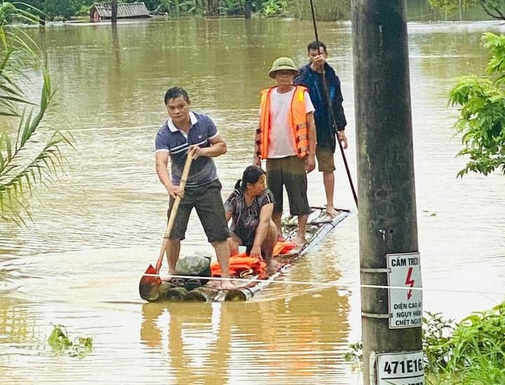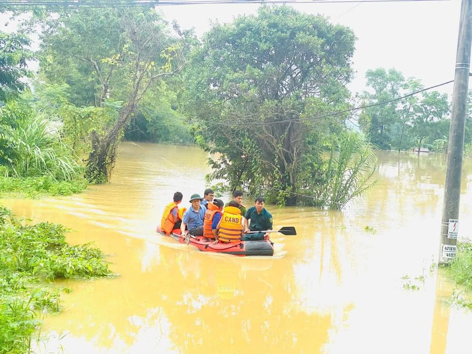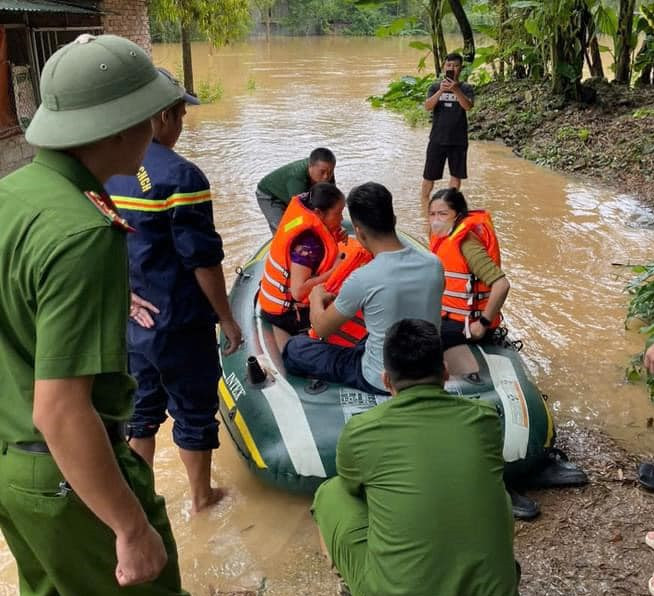 | Lực lượng Công an, dân quân địa phương hỗ trợ dân sơ tán người đồ đạc ra khỏi vùng lũ. |