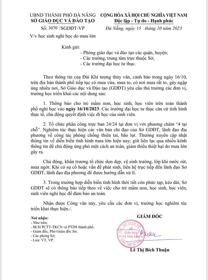 Theo thông tin của Đài Khí tượng thủy văn, cảnh báo trong ngày 16/10, trên địa bàn thành phố tiếp tục có mưa vừa, mưa to, có nơi mưa rất to, gây ngập úng nhiều nơi, Sở Giáo dục và Đào tạo Đà Nẵng đã ra thông báo về việc nghỉ học của học sinh.