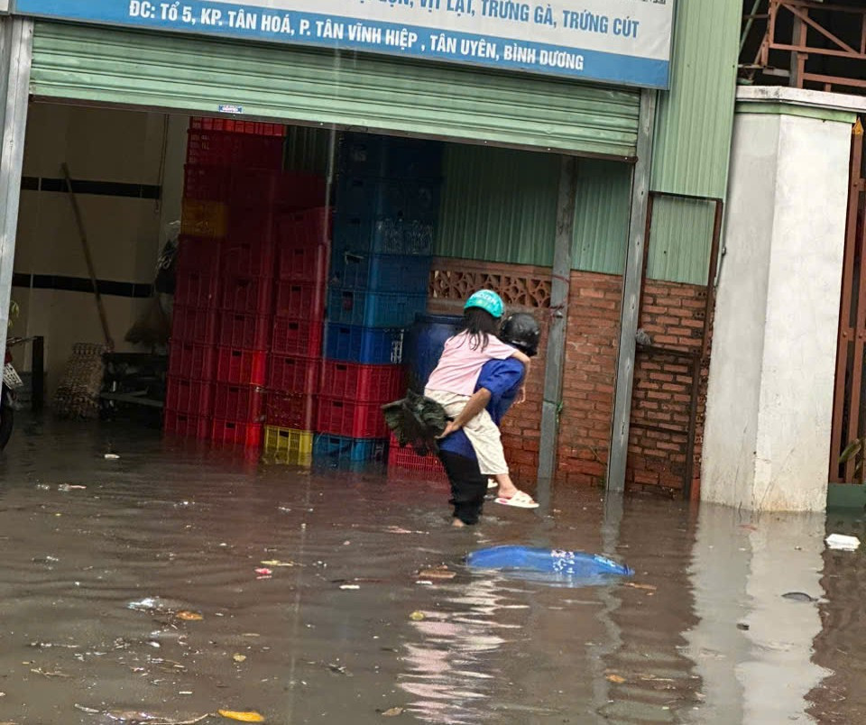 Đường ĐX08 ngập sâu, nước tràn vào nhà dân. Theo lời một số người dân nơi đây, đường này "cứ mưa là ngập" do một công ty xây chặn miệng cống, nước thoát chậm.