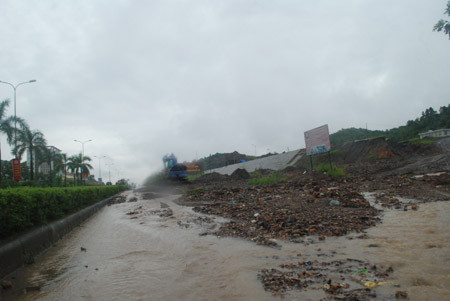 Mưa to cũng đã làm ngập đoạn đường Nhạc Sơn là con đường chính lên cửa khẩu Kim Thành. Lực lượng chức năng phải tạm cấm đường để đảm bảo cho xe máy qua lại.