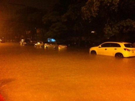 Một con đường gần khu đô thị Việt Hưng, Long Biên chìm trong biển nước. Ảnh: otofun