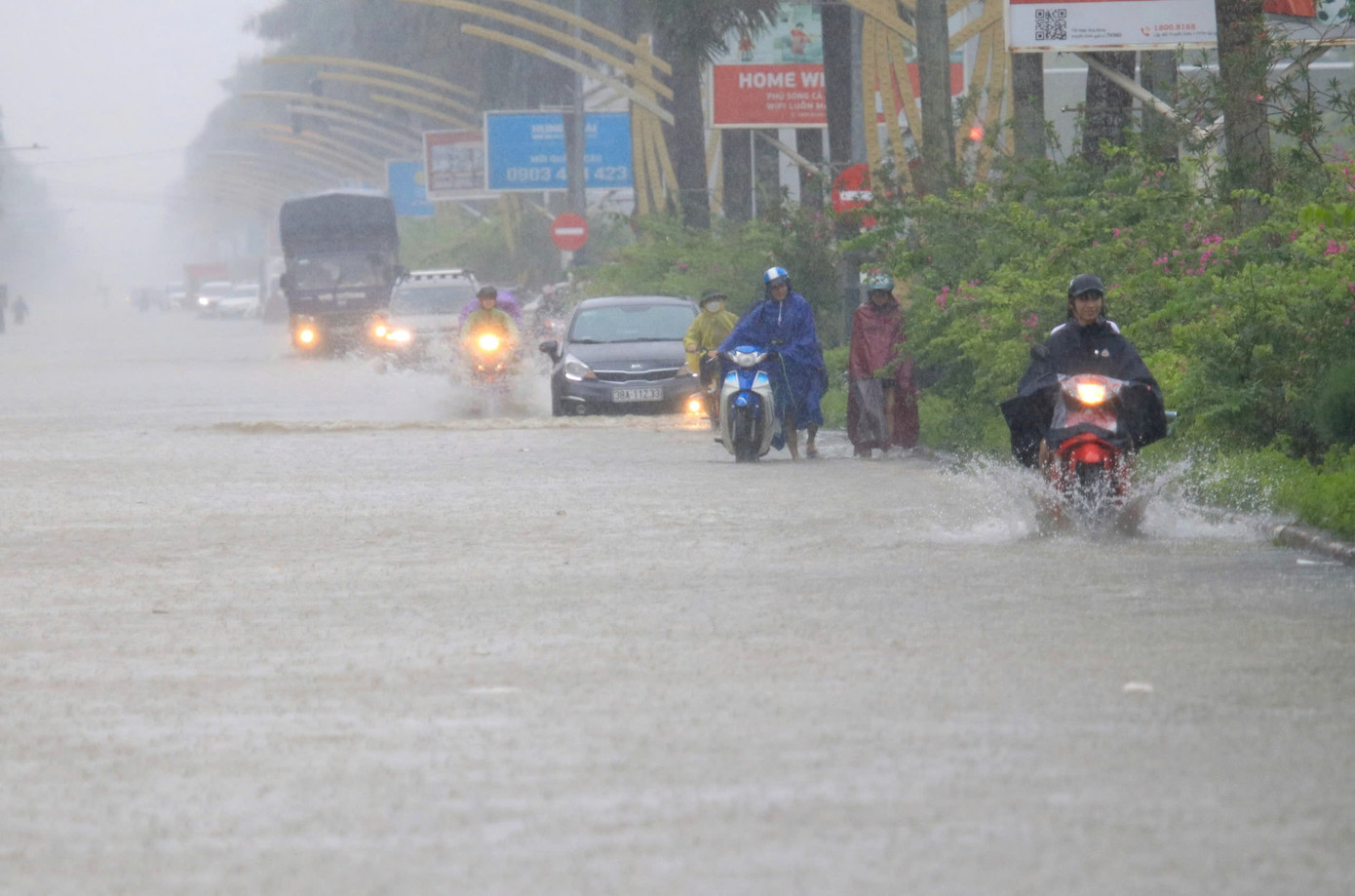 | Tại thành phố Vinh, mưa lớn đã gây ngập tại các tuyến phố, một số điểm ngập sâu 0,7m, phương tiện giao thông chết máy ngổn ngang. Lực lượng chức năng căng dây cảnh báo, cấm phương tiện đi vào đoạn ngập sâu. |