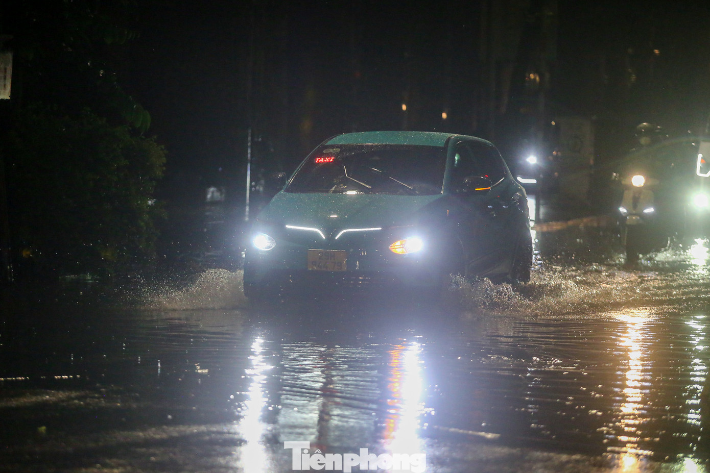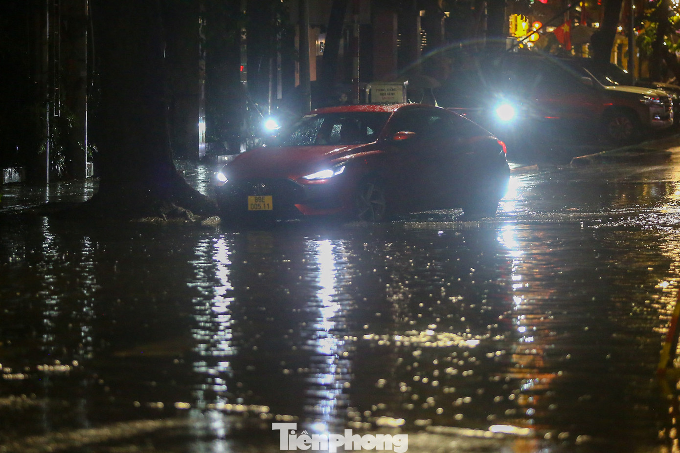 | Khoảng 21h ngày 8/6, nước vẫn chưa rút hết trên phố; các phương tiện chỉ có thể di chuyển chậm qua khu vực bị ngập. |