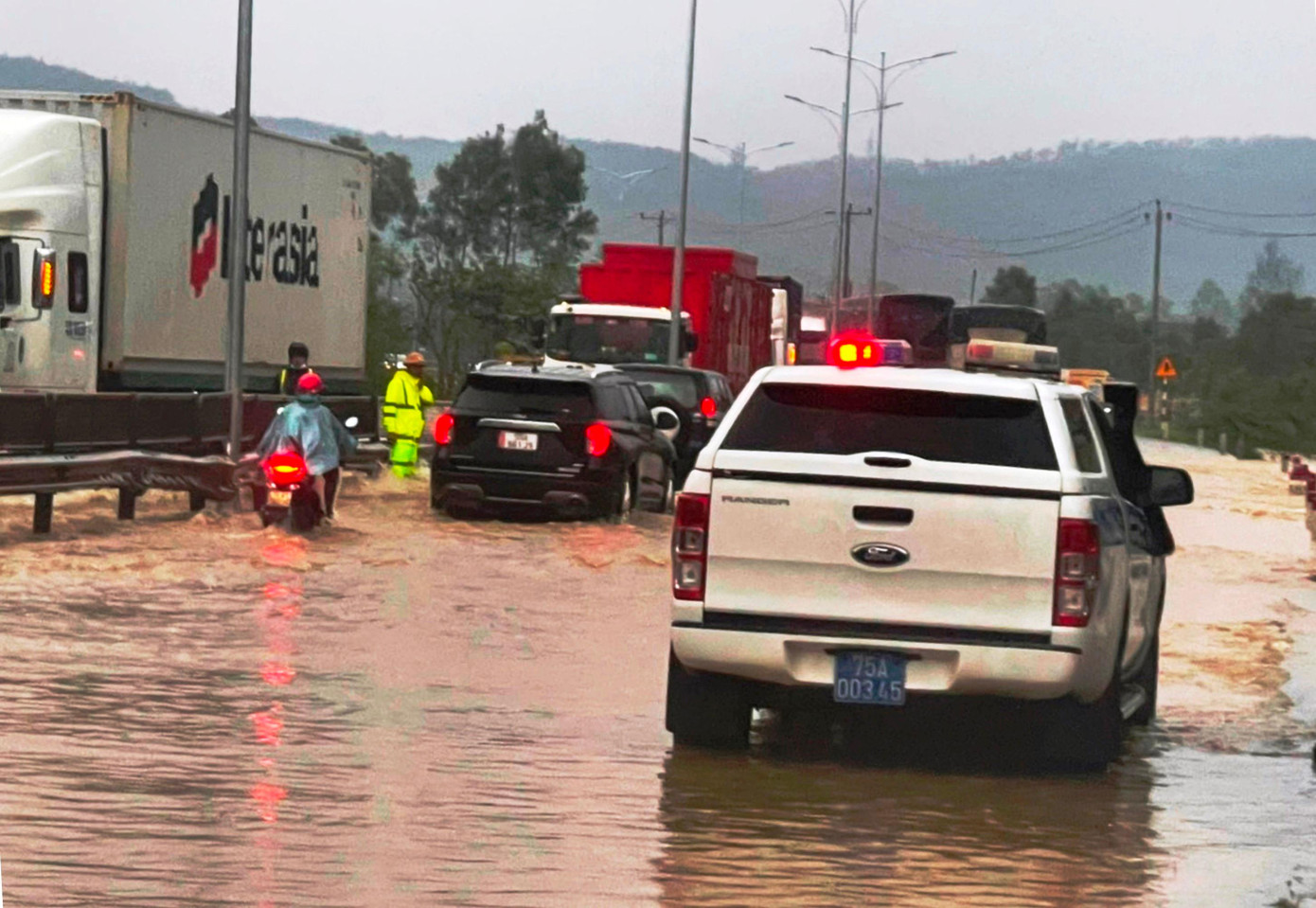 | Các phương tiện giao thông gặp khó khăn khi di chuyển qua đoạn Quốc lộ 1 bị ngập lụt thuộc địa phận xã Lộc Trì, huyện Phú Lộc, tỉnh TT-Huế. Ảnh: CA |