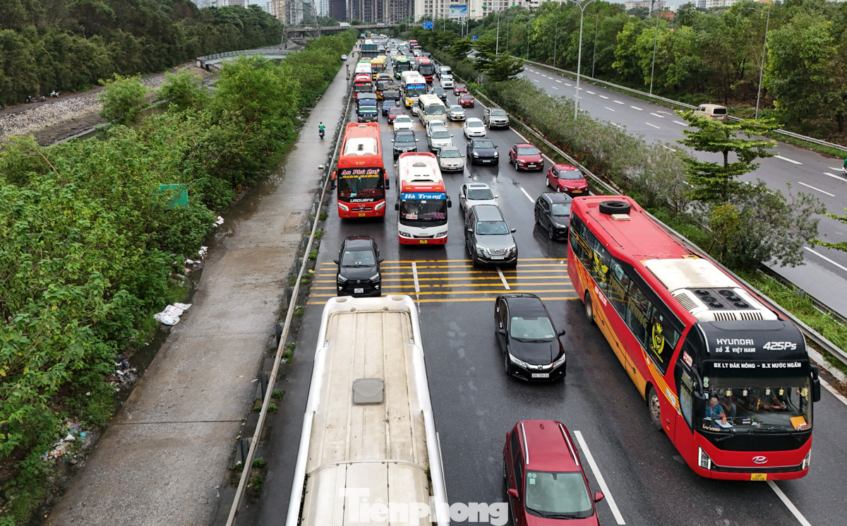 | Phía sau, từng dòng phương tiện di chuyển chậm trên cao tốc Pháp Vân - Cầu Giẽ. |