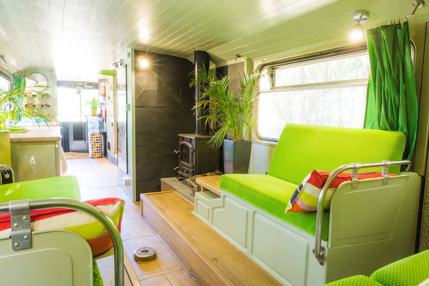 Phía đầu xe buýt, nơi khách có thể đọc sách và thư giãn trên hai chiếc ghế đã được sửa sang.