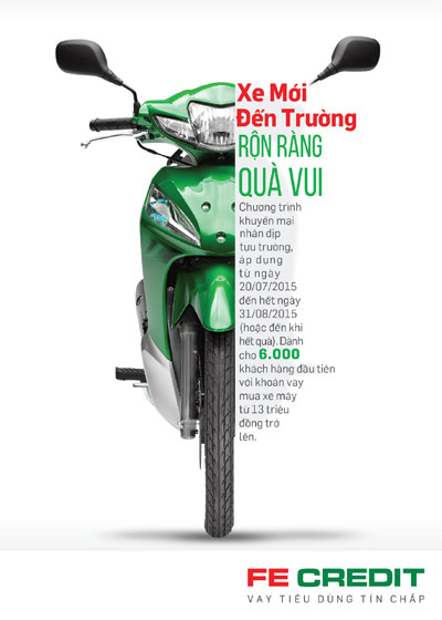 Nhằm chung tay cùng các bậc phụ huynh trang bị cho con em mình phương tiện đi lại và những vật phẩm cần thiết cho mùa tựu trường sắp tới, từ ngày 20-7-2015, FE Credit triển khai chương trình khuyến mãi “Xe Mới Tới Trường, Rộn Ràng Quà Vui”với hàng nghìn balô, áo mưa và nón bảo hiểm năng động dành tặng cho 6.000 khách hàng đầu tiên mua xe máy trả góp với khoản vay từ 13 triệu đồng trở lên và được duyệt hồ sơ trong thời gian khuyến mãi.
