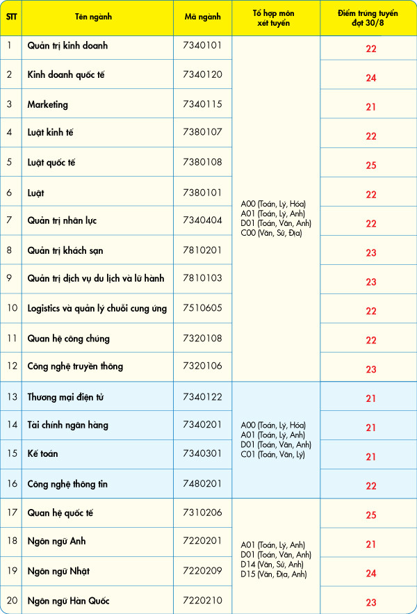 Theo đó, mức điểm trúng tuyển ở nhiều ngành tăng cao so với đợt trước. Điển hình như ngành Luật quốc tế, Quan hệ quốc tế có mức điểm trúng tuyển ở tất cả các tổ hợp môn là 25; ngành Kinh doanh quốc tế, ngành Ngôn ngữ Nhật là 24 điểm. Các ngành còn lại có mức điểm trúng tuyển từ 21 – 23. Từ thời điểm này, UEF sẽ không tiếp tục nhận hồ sơ xét tuyển học bạ.