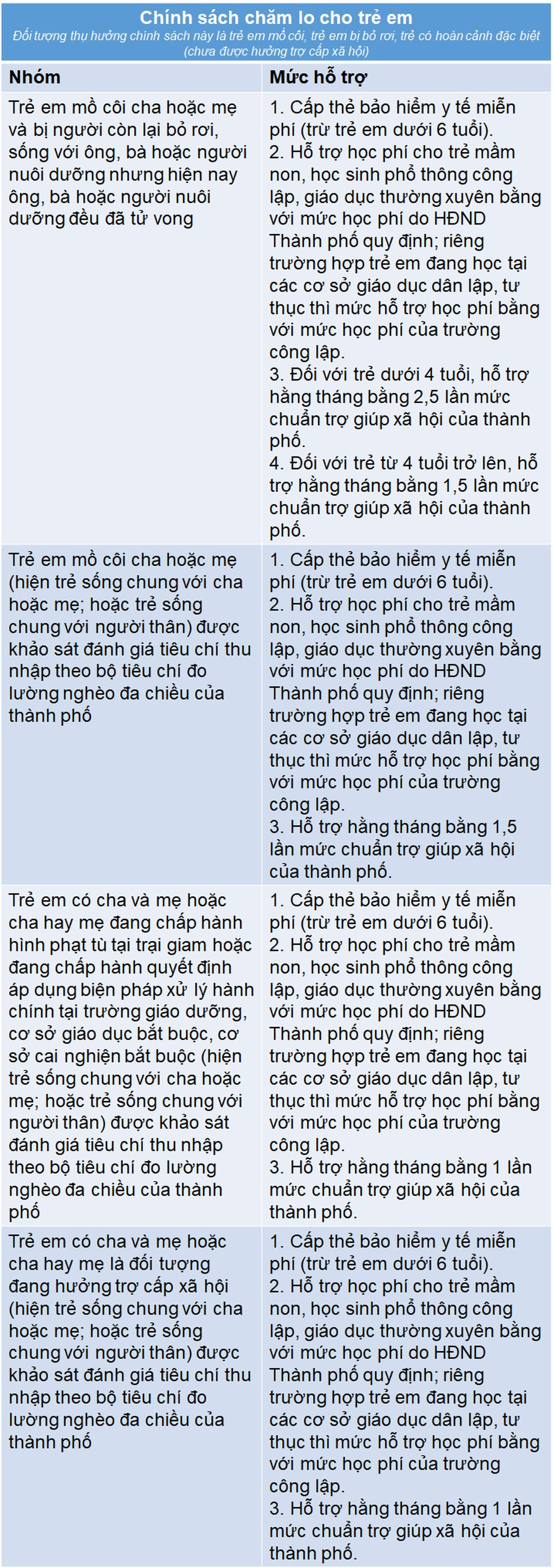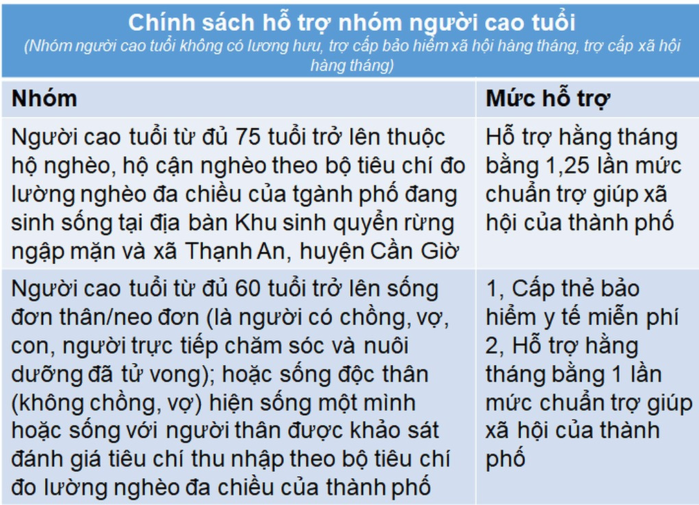 Trước tình hình đó, TPHCM đã kịp thời ban hành chương trình hỗ trợ người dân, trong đó có Nghị quyết số 02/2022/NQ-HĐND ngày 7/4/2022 về chính sách đặc thù chăm lo, hỗ trợ người cao tuổi, trẻ em mồ côi và những đối tượng có hoàn cảnh khó khăn trên địa bàn thành phố, có hiệu lực từ ngày 1/5/2022 đến hết ngày 31/12/2023.