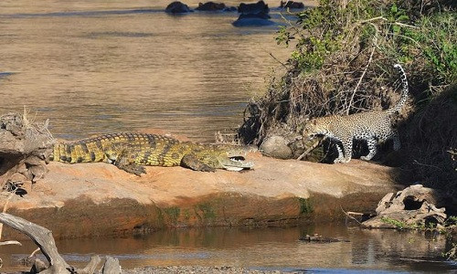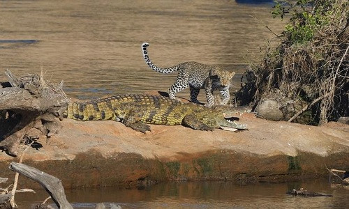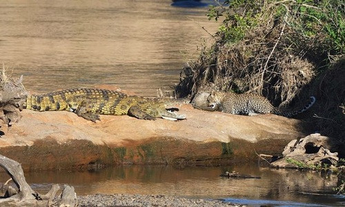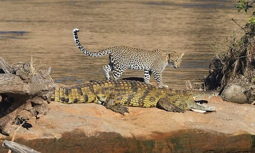 Báo đốm nổi tiếng với tốc độ mau lẹ lên đến 60 km/h. Nhưng cá sấu cũng là đối thủ xứng tầm với hàm răng có lực cắn lên tới 260 kg/cm2.