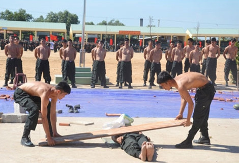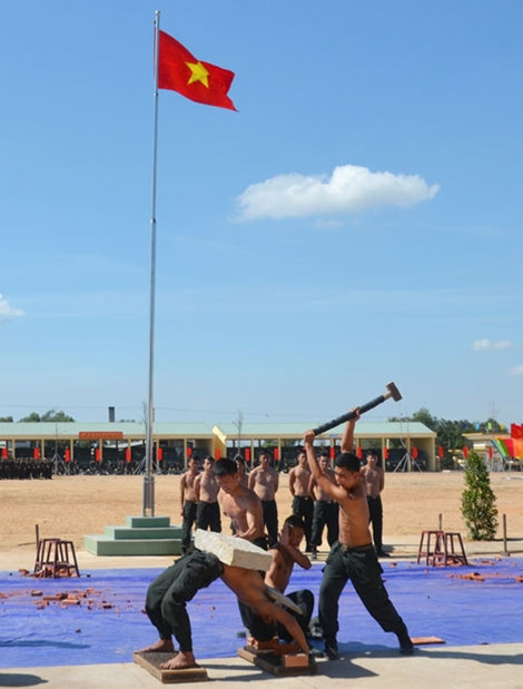 Hàng ngày, các chiến sĩ Cảnh sát Cơ động phải đối mặt với những tình huống nguy hiểm và nhiều đối tượng khác nhau nên phải trang bị cho mình những kiến thức võ thuật, kỹ năng chiến đấu cùng một tinh thần bình tĩnh cao độ để xử lý và nhanh nhẹn mưu trí trong tác chiến. Trong ảnh: Chiến sĩ Cảnh sát Cơ động biểu diễn nội công.