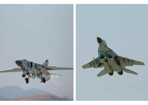 Các hình ảnh của KNCA cho thấy cuộc tập trận của Triều Tiên có sự góp mặt của tiêm kích hiện đại MiG-29, máy bay cường kích Su-25, tiêm kích cánh cụp cánh xòe MiG-23…