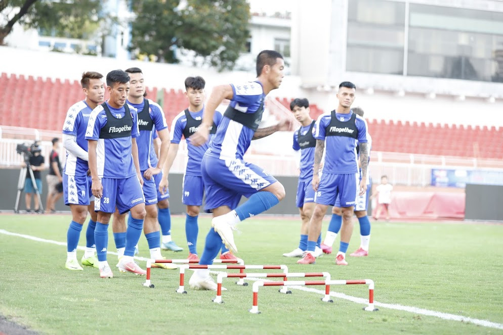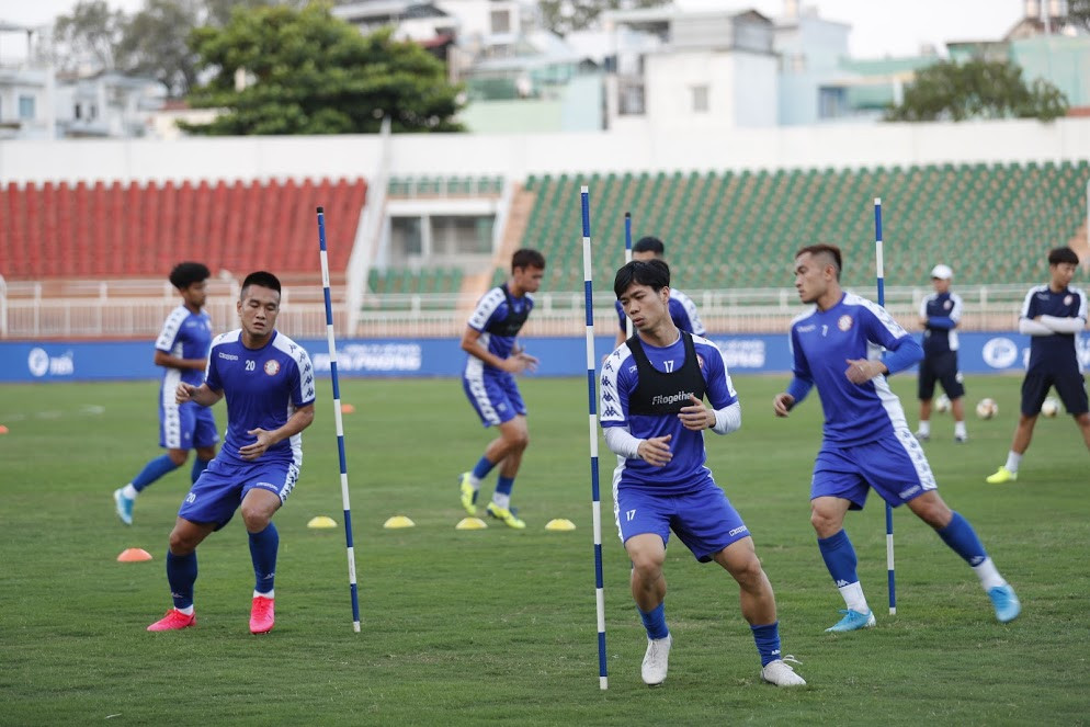 Các cầu thủ TPHCM nghiêm túc trên sân tập.