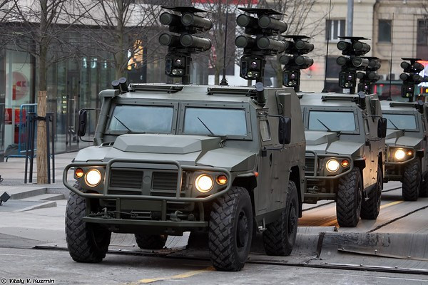 Các phương tiện vũ khí hạng nặng tham gia duyệt binh 9/5 tiến vào thành phố Moscow cổ kính khi trời còn đang sáng trắng. Ảnh: Các xe chiến đấu tổ hợp tên lửa chống tăng tự hành Kornet-D.